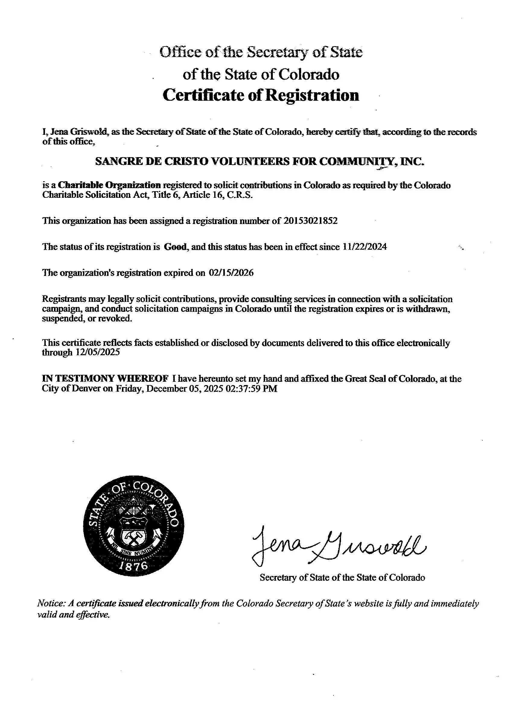 Our Charitable Certificate of Good Standing and Certificate of Registration with the Colorado Secretary of State can be found at the bottom of this page.